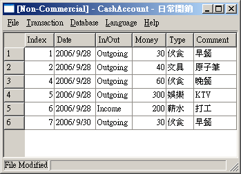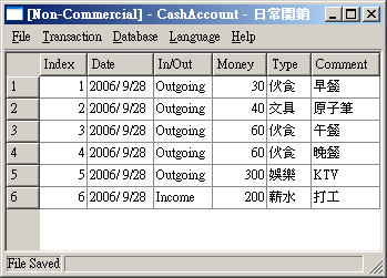 在管理交易之前,我們先介紹如何管理型別。圖1-2-3顯示出目前資料庫(daily.cadb)的型別有<無>、伙食、文具、娛樂、薪水。