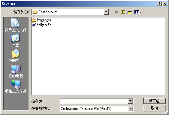 如果目前資料庫是新建立的資料庫(如圖1-1-2和圖1-1-3),也就是尚未存檔的資料庫,選擇了這個選項時,程式會顯示如圖1-1-6的視窗,讓使用者選擇儲存的檔案。