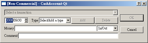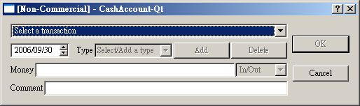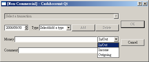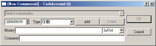 要構成一筆交易的必要條件,必須將Date(日期)、Type(型別)、Money(金額)、Income/Outgoing(收入/支出)這四個欄位確實填入或選擇。