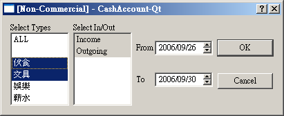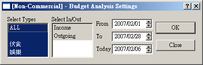 如圖1-3-3,使用者可以指定只要計算哪些特定型別(圖中為「伙食」和「文具」),也可以只計算支出或收入的部份。
