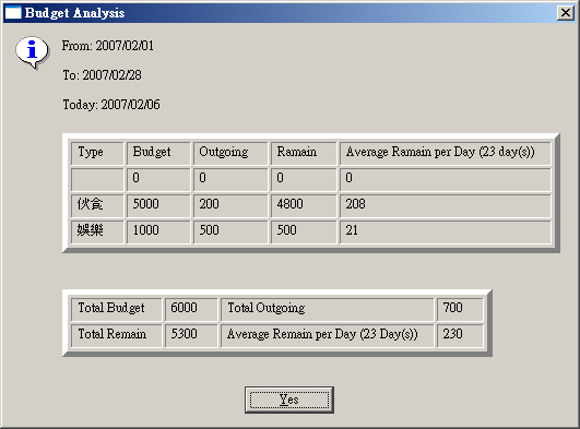 (2)「Today」則是用來計算到這天的支出和預算的關連,也不一定要設定為當天,以這範例而言,也可以設定2007/02/04,取得在該天的預算分析資料。當然,