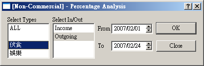 此功能是要提供使用者一些有關於每個型別相對於總金額的百分比分析。我們依舊以daily2.cadb做範例,選擇方式則如圖1-3-8。結果則如圖1-3-9。