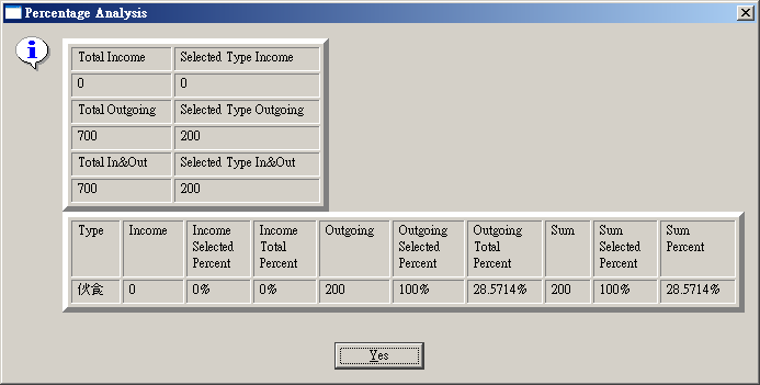 如此一來,就可以透過這個分析工具來得知每一個型別分別佔了收入或支出的多少百分比,幫助使用者快速獲得資訊來了解他的收入支出行為,並藉以調整其生活開銷的型態。